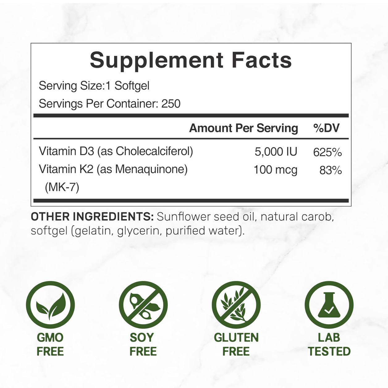 5. Cápsulas Blandas De Vitamina D3 K2 – D3 + K2 de alta biodisponibilidad para ayudar a mantener huesos fuertes, un buen uso del calcio y un sistema inmunitario en buen estado.