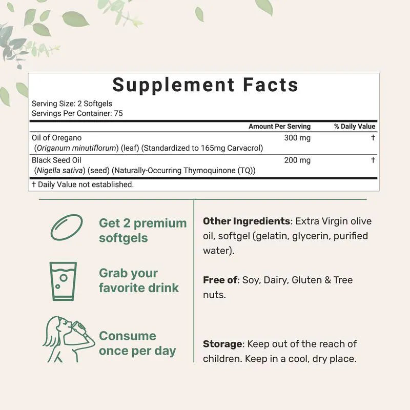 1. Cápsulas Blandas De Aceite De Orégano Y Semilla Negra – Aceites herbales concentrados que apoyan el bienestar estacional, la comodidad respiratoria y las defensas diarias.